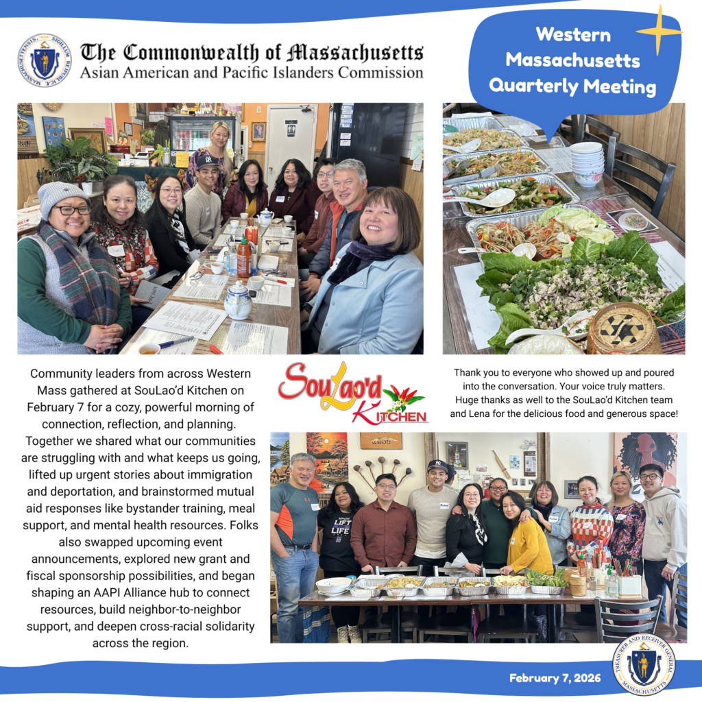 At the April 2025 quarterly meeting, the AAPIC Western Mass community gathered to share updates, celebrate cultural work, and identify urgent priorities for the region. Participants highlighted the importance of cultural preservation, youth engagement, and cross-community collaboration, while also voicing serious concerns about immigration enforcement, community safety, mental health needs, and unequal representation compared to Boston. The meeting brought renewed calls for increased staffing—particularly more hours for the Western Mass Regional Coordinator—a dedicated physical office space, and better systems for outreach, translation, and funding access. Community members emphasized the need for stronger infrastructure, more frequent and flexible meetings, and deeper engagement from the Commission to support grassroots efforts and take meaningful action on the issues most affecting Western Massachusetts.